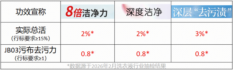 部分洗衣液吸睛的功效承诺与实际清洁能力不符。