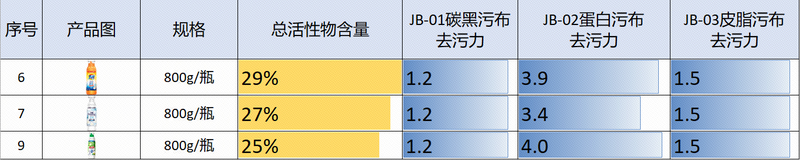 去污力同样两极分化。在对蛋白质类污渍(如血渍、奶渍)的测试中,表现最佳的产品(4.2)与最差的产品(1.0),效果相差超过4倍——相当于“洗一遍和洗四遍的区别”。在对导致领口发黄的皮脂污布去污力测试中,有5款产品数值只有0.8,未达到标准要求,证明其连日常衣物的黄渍、汗渍都洗不干净。