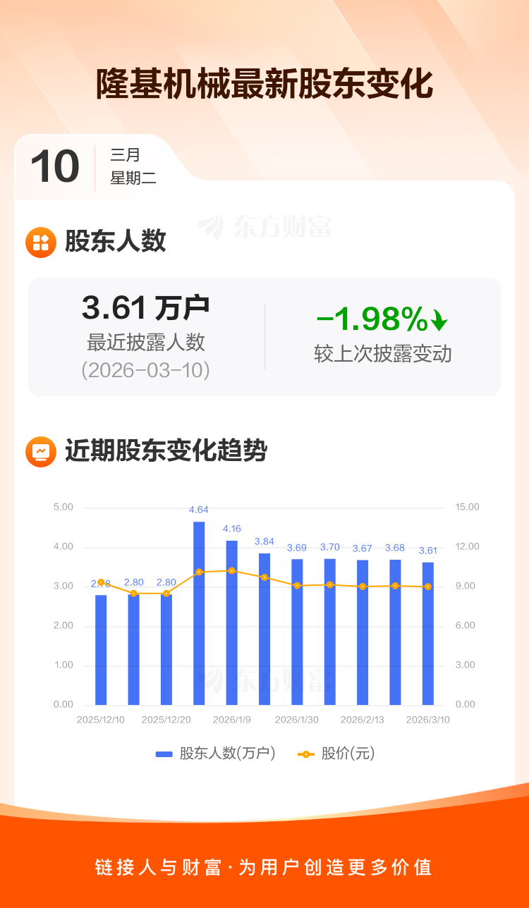 隆基机械最新披露数据显示,截至3月10日公司股东户数为3.61万户,较上期(2026年2月28日)减少728户,降幅为1.98%。户均持有流通股数量由上期的1.13万股上升至1.15万股,户均持股金额由上期的10.21万元增加至10.35万元。