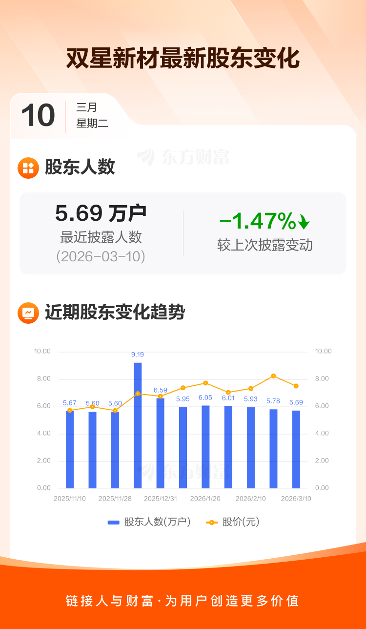 双星新材最新披露数据显示,截至3月10日公司股东户数为5.69万户,较上期(2026年2月27日)减少852户,降幅为1.47%。户均持有流通股数量由上期的1.53万股上升至1.56万股,户均持股金额由上期的12.61万元减少至11.65万元。