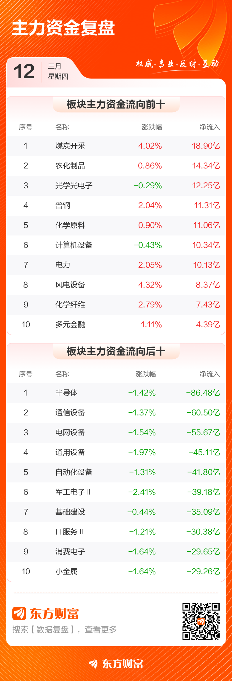 3月12日,沪指跌0.1%,深成指跌0.63%,创业板指跌0.96%。两市成交额2.44万亿,较上个交易日缩量665亿。数据显示,今日大盘主力资金净流出720.35亿。煤炭开采、农化制品、光学光电子等板块主力资金流入排名居前,其中煤炭开采净流入18.90亿元。