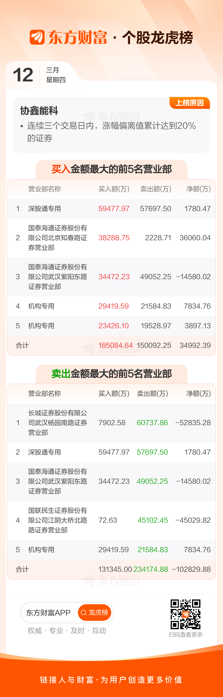 交易所2026年3月12日公布的交易公开信息显示,协鑫能科因成为日涨幅偏离值达到7%的前5只证券、连续三个交易日内,涨幅偏离值累计达到20%的证券上榜。协鑫能科当日收报21.36元,涨跌幅9.99%,偏离值10.68%,换手率21.41%,成交额72.52亿。异常期间3月10日至3月12日,期间涨幅24.33%,累计偏离值22.66%,区间成交额207.44亿。