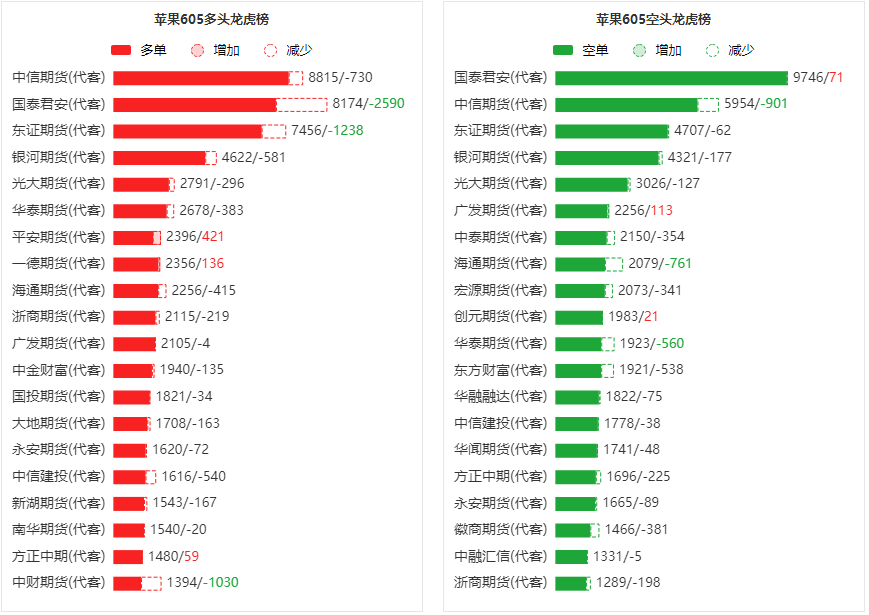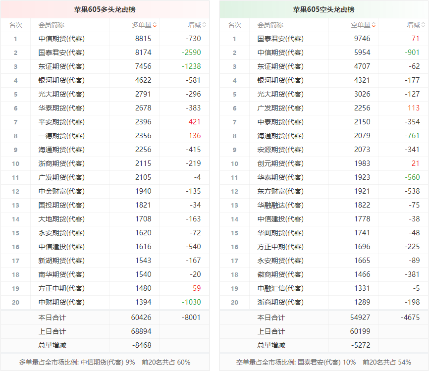 总体而言,苹果605合约今日减仓下行,多空持仓排名前20席中,多空双方均呈退场态势,多头退场意愿强于空头。