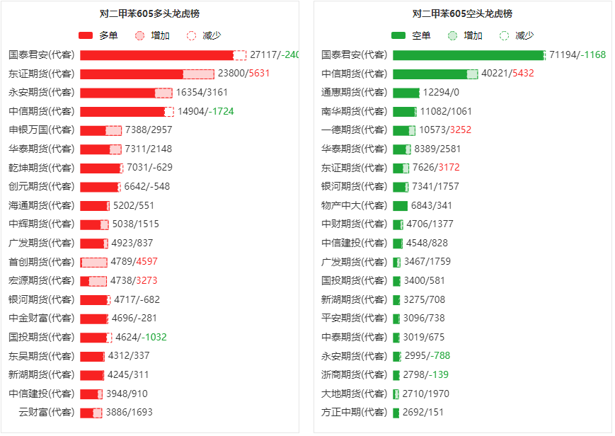 总体而言,对二甲苯605合约今日增仓上行,多空持仓排名前20席中,多空双方均呈进场态势,多头进场意愿弱于空头。