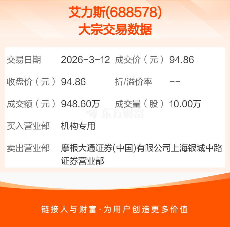 2026年3月12日,艾力斯发生1笔大宗交易,共成交10.00万股,成交金额948.60万元,占其流通市值比例为0.02%。