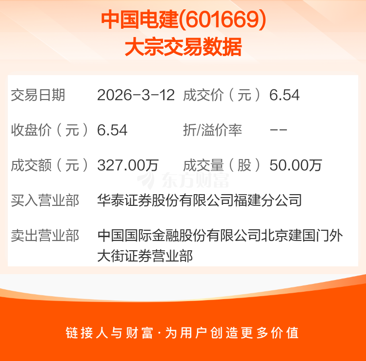 2026年3月12日,中国电建发生1笔大宗交易,共成交50.00万股,成交金额327.00万元。