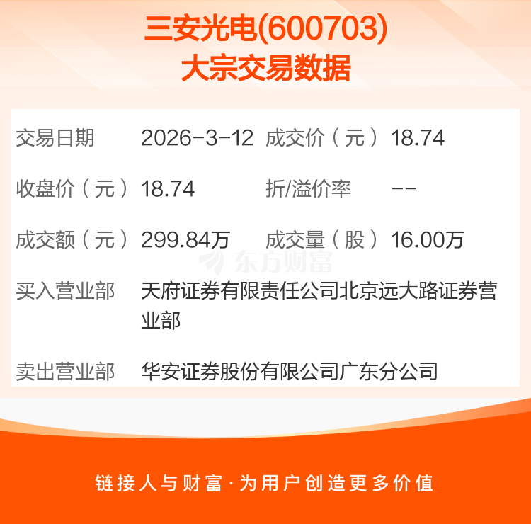 2026年3月12日,三安光电发生1笔大宗交易,共成交16.00万股,成交金额299.84万元。