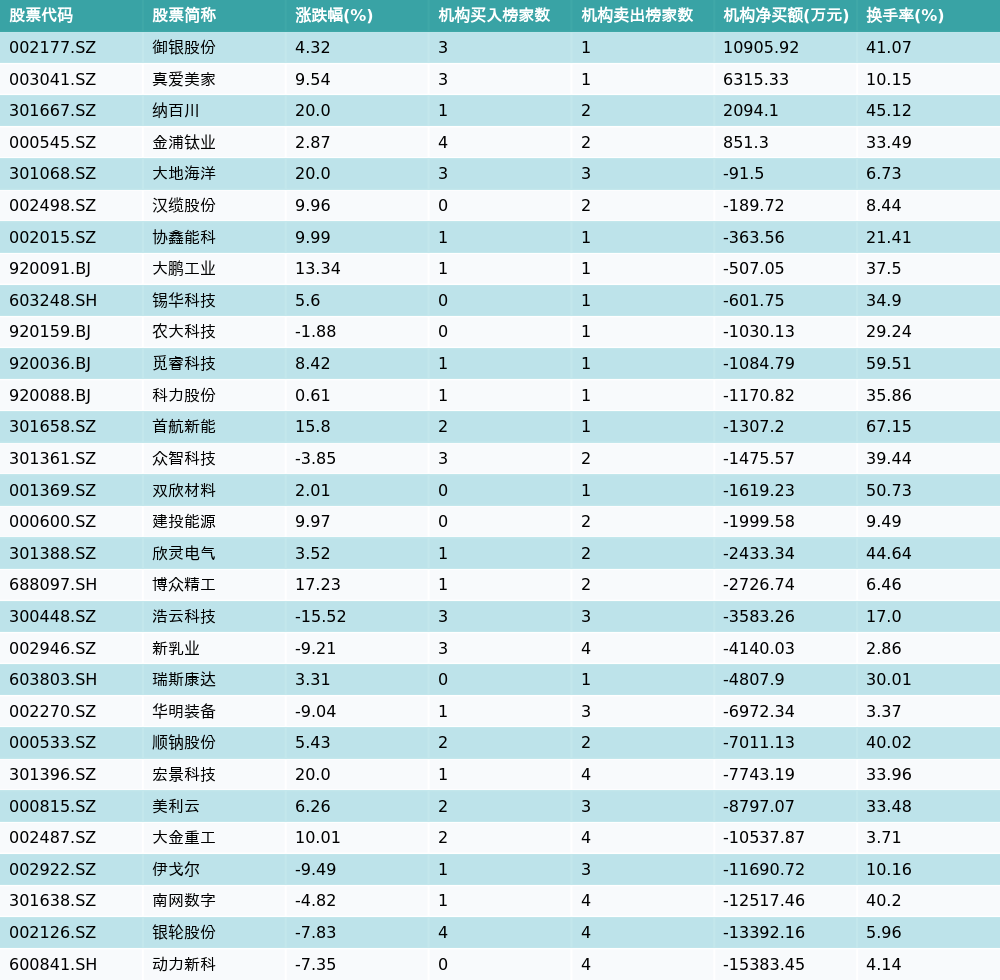 南财智讯3月12日电,盘后数据显示,因当日异动登上龙虎榜的个股中,30只沪深A股龙虎榜出现了机构的身影,机构合计净卖出103010.91万元,具体来看,机构净买入4只个股,净卖出26只个股。其中,机构净买入前三分别为御银股份(002177.SZ)、真爱美家(003041.SZ)与纳百川(301667.SZ),详情见下图:机构净卖出的个股中,前三分别为动力新科(600841.SH)、银轮股份(002126.SZ)与南网数字(301638.SZ)。
