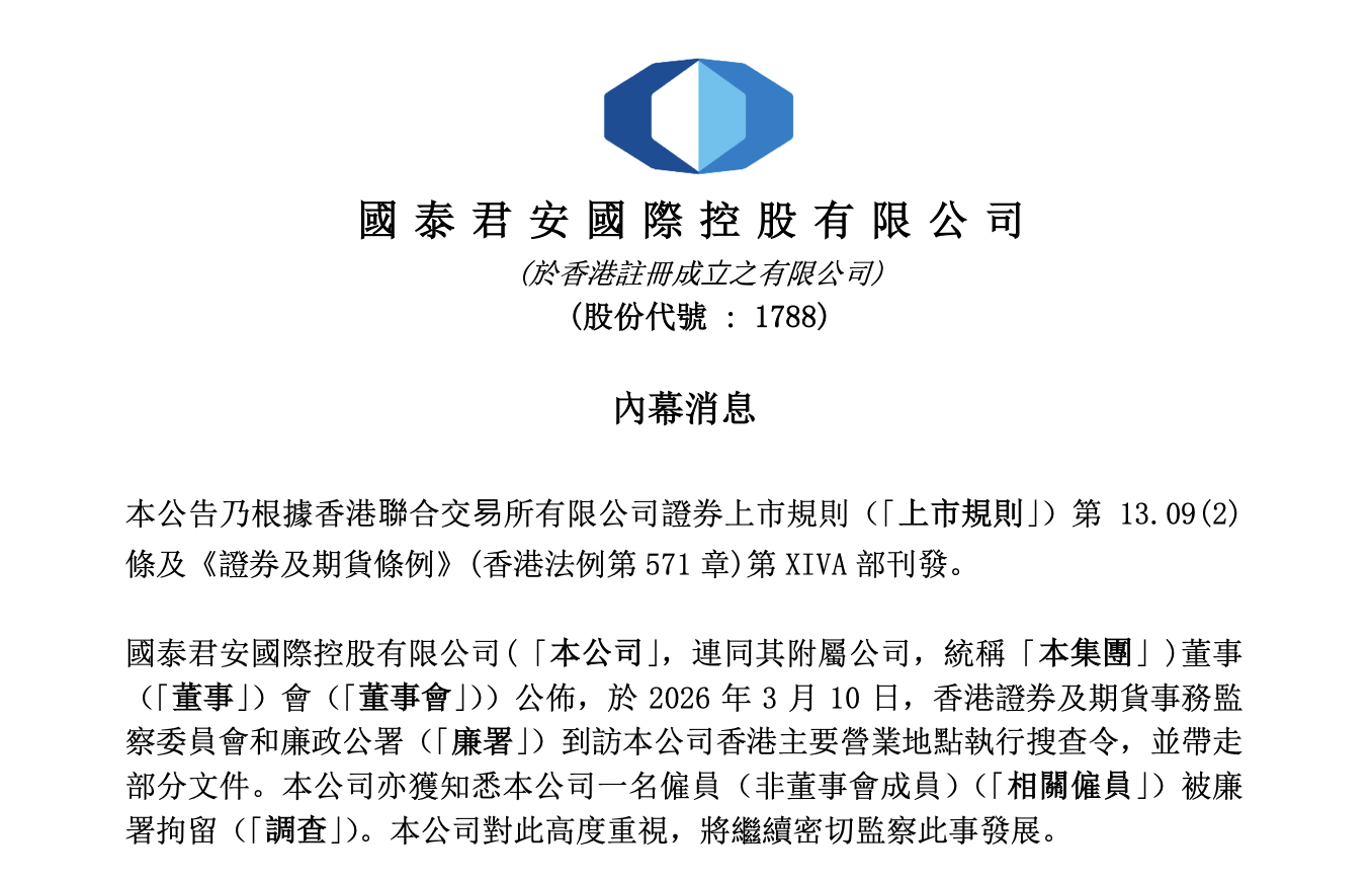 国泰君安国际于3月12日发布公告,确认3月10日香港证监会与廉署到访公司主要营业地点执行搜查令,并带走部分文件,公司证实一名雇员(非董事会成员)被廉署拘留调查,并已实时暂停其所有营运及执行职务的权力。从多方消息来看,这名雇员应该就是2024年6月刚晋升为董事总经理及ECM主管、在国泰君安国际已服务近11年的潘举鹏。