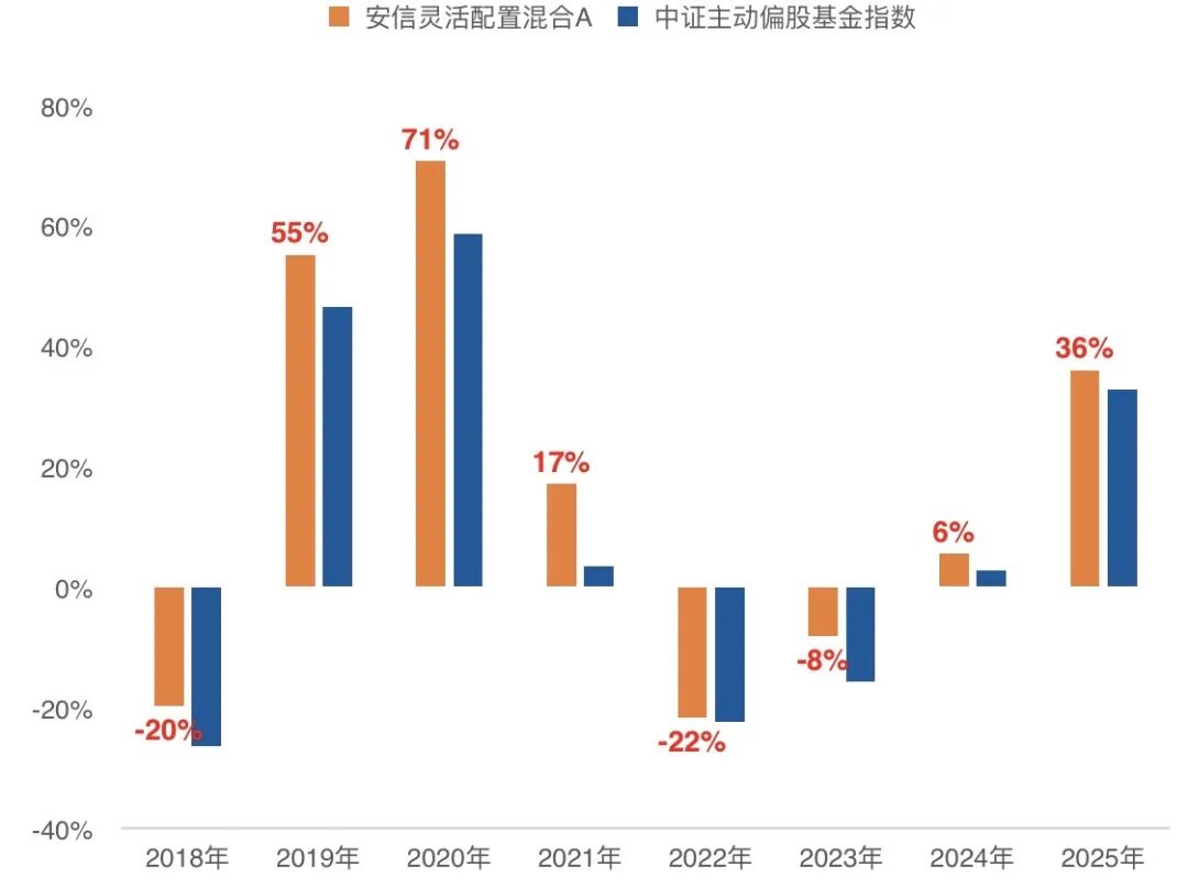 这种逆向投资基于对供给端拐点的深度研究和价值被低估的判断。自张竞管理以来(2017.12.29-2026.1.30),其代表产品“安信灵活配置”任职回报195.86% (业绩比较基准 20.68%),历史年化回报14.34% (中证主动偏股基金指数历史年化6.98%),长期显著跑赢沪深300和主动偏股指数。