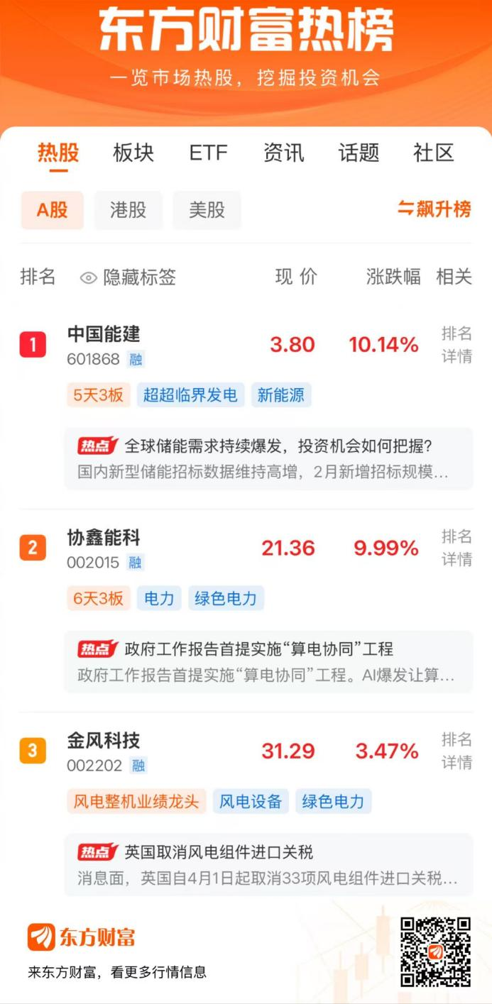 3月12日,两市震荡调整,三大指数均小幅收跌。东方财富热榜前三的股票中,中国能建位列第1,协鑫能科位列第2,金风科技位列第3。