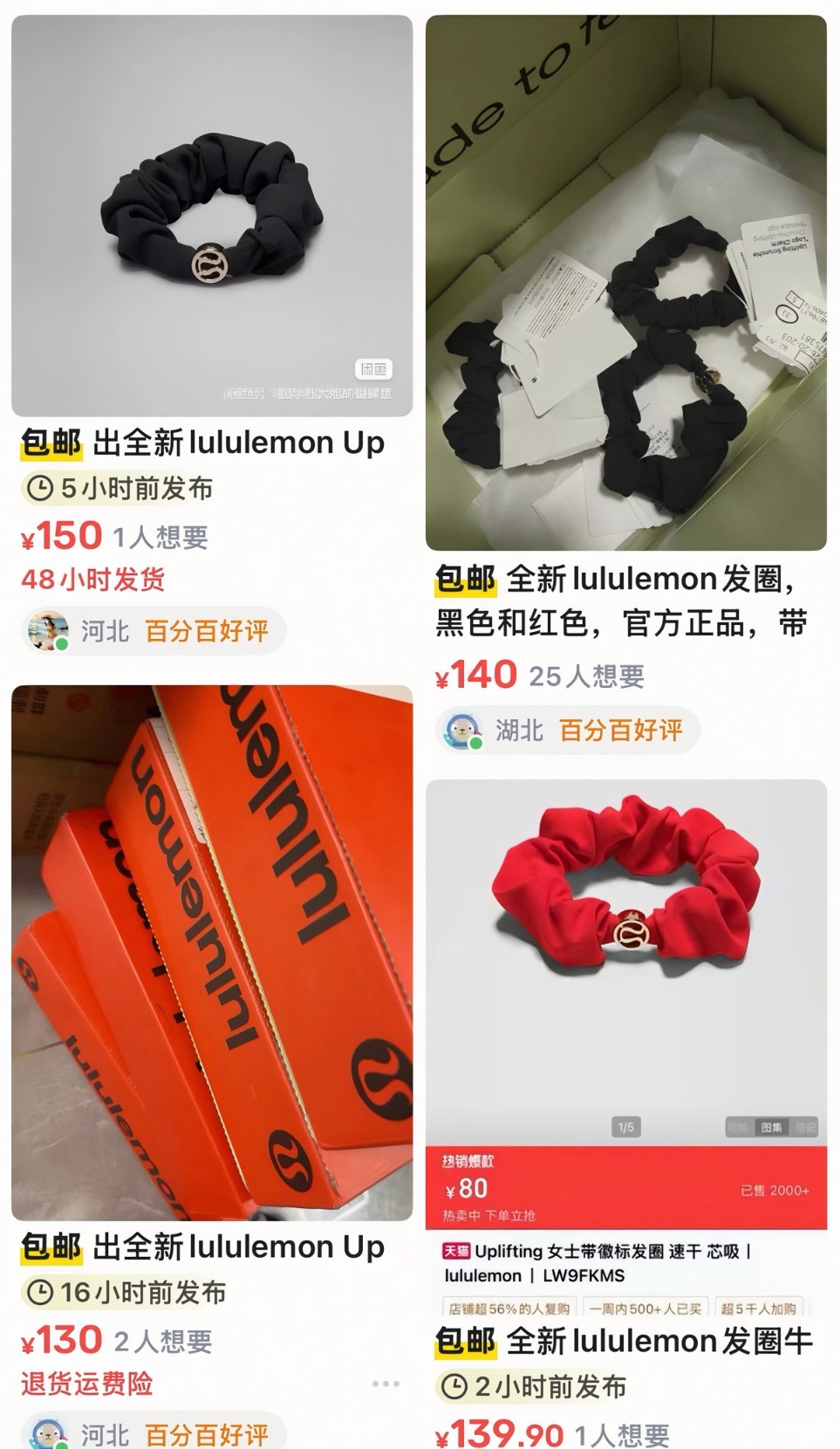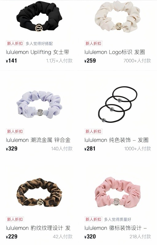 值得注意的是,Lululemon线上旗舰店内还有多款高价发圈产品,如180元3只装的带徽标发绳、220元3只装的带挂坠发绳等,定价均远超普通饰品,且二手平台也存在溢价售卖的情况。