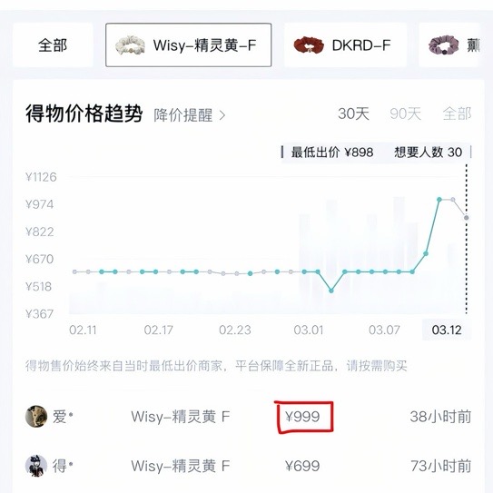 得物App显示,该款发圈有较高的市场溢价,标价飙涨至数百元。“精灵黄”色款价格更是被炒至999元,较原价溢价超12倍。