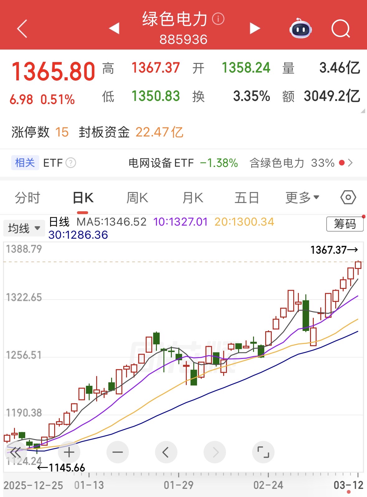 3月12日,绿色电力概念板块走势活跃,多只股票涨停。