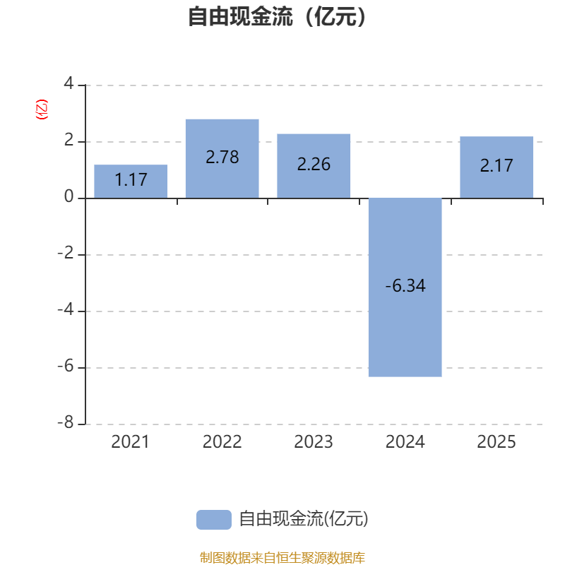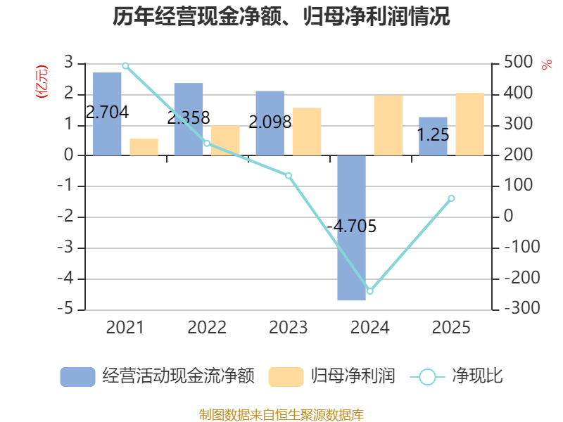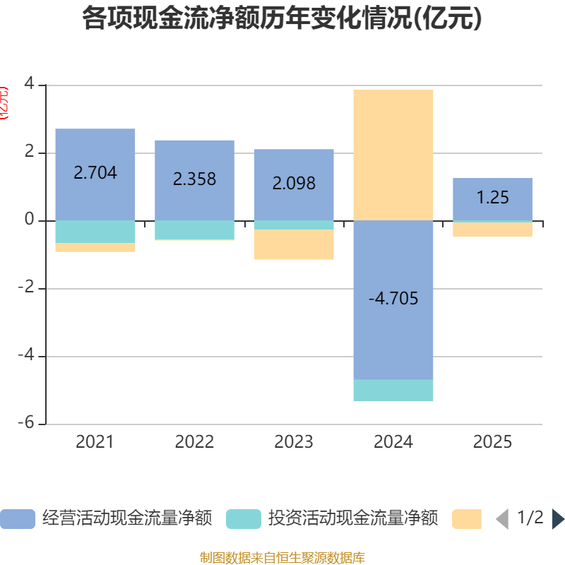 截至2025年,公司经营活动现金流净额为1.25亿元,同比增加5.95亿元;筹资活动现金流净额-4151.47万元,同比减少4.27亿元;投资活动现金流净额-672.31万元,上年同期为-6288.76万元。