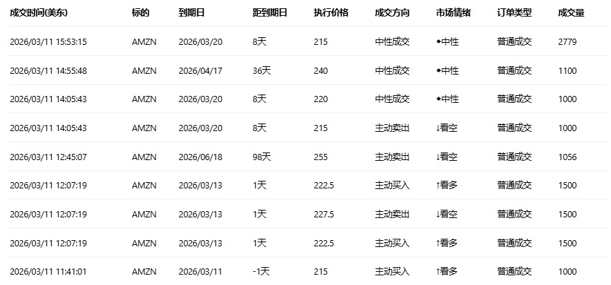 亚马逊收跌0.78%,成交60.92万份期权合约,看跌/看涨成交量比降至0.53。亚马逊发行370-420亿美元债券为AI基础设施建设筹资。