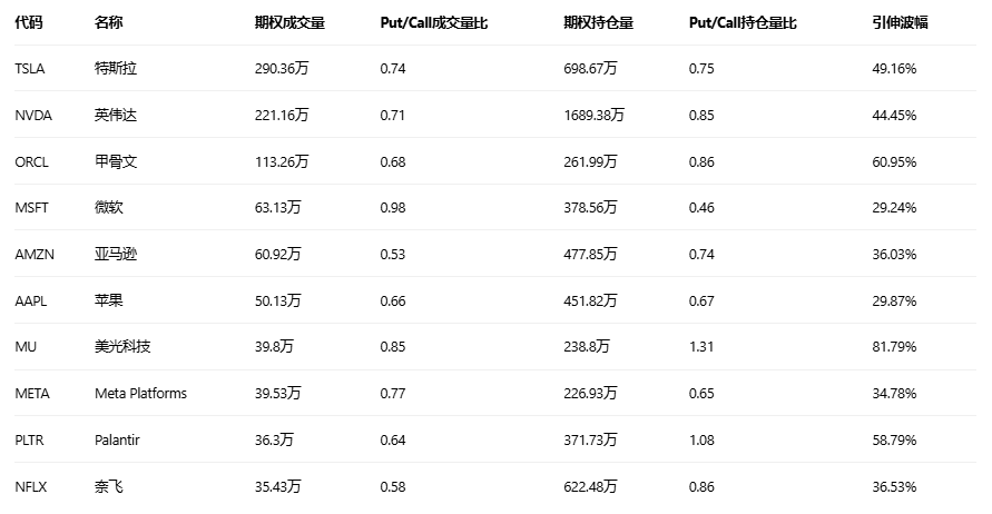 看跌/看涨持仓量比最高是美光科技,达到1.31。美光科技获花旗分析师上调目标价至430美元,预期DRAM价格2026年将上涨171%。