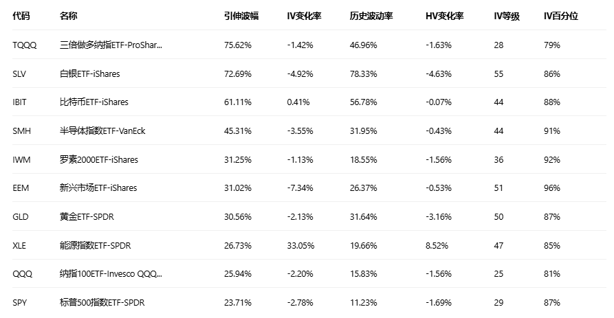 引申波幅排行榜(标的市值>10亿美元,且期权成交量>10万)