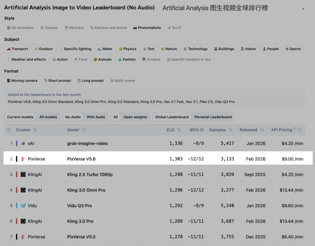截至2026年2月底,在全球权威AI评估机构Artificial Analysis发布的最新榜单中,PixVerse V5.6(拍我AI)在图生视频(Image to Video)与文生视频(Text to Video)两大核心赛道均名列全球第二,稳居全球视频生成模型第一梯队。