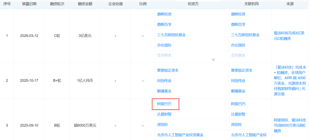 2025年9月,爱诗科技宣布完成超6000万美元B轮融资,这次是阿里巴巴领投,达晨财智、深创投、北京市人工智能产业投资基金、湖南电广、巨人网络和Antler等跟投。