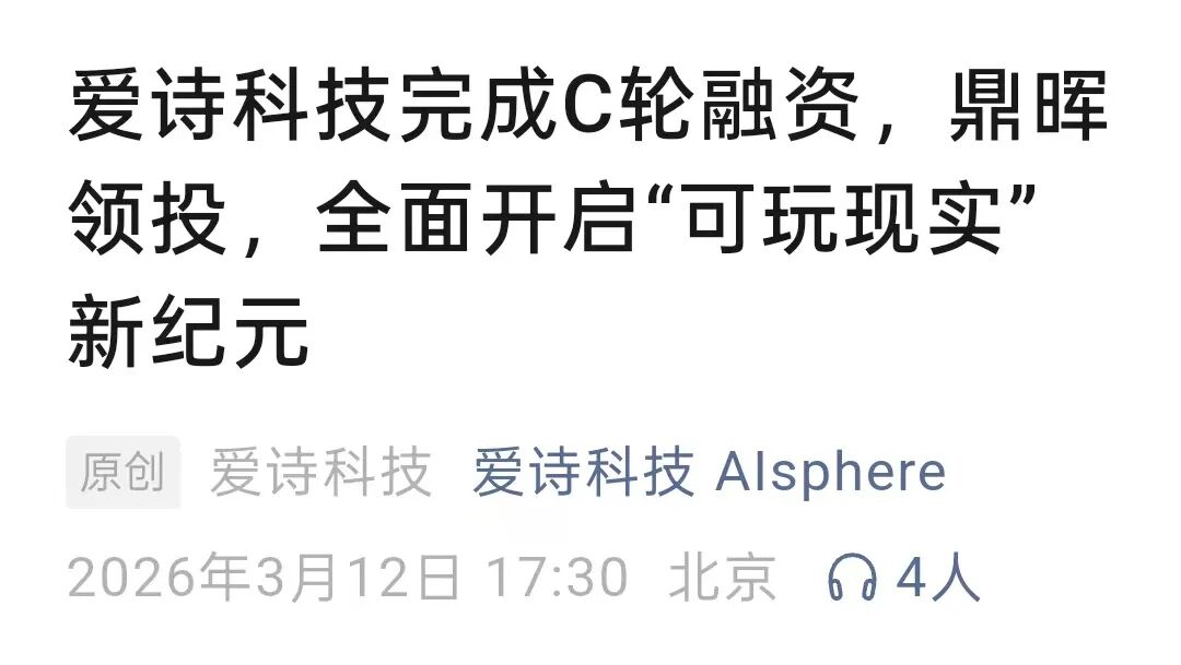 3月12日,AI视频生成企业爱诗科技宣布完成了3亿美元C轮融资,由鼎晖香港基金、鼎晖VGC、鼎晖百孚领投,产业投资人中国儒意、三七互娱等近20家投资机构参投。