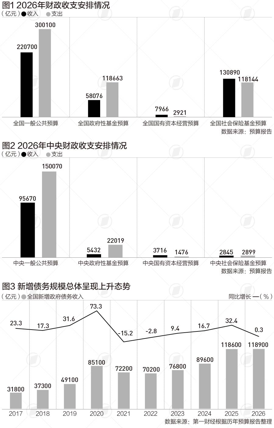 根据近期公开的《关于2025年中央和地方预算执行情况与2026年中央和地方预算草案的报告(摘要)》(下称“预算报告”),全国一般公共预算收入预计22.07万亿元,增长2.2%,加上调入资金及使用结转结余2.05万亿元,收入总规模为24.12万亿元;全国一般公共预算支出预计30.01万亿元,增长4.4%;赤字(支出超出收入部分)达5.89万亿元。这一赤字规模将通过发行5.89万亿元政府债券来弥补,最终实现全国一般公共预算收支平衡。