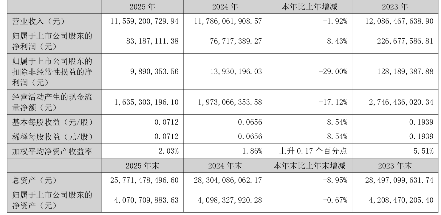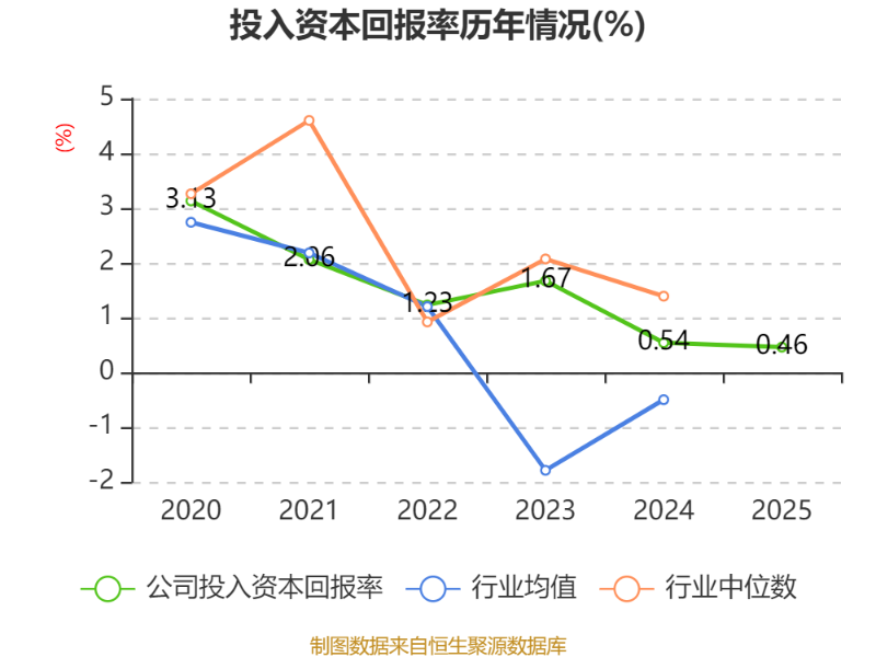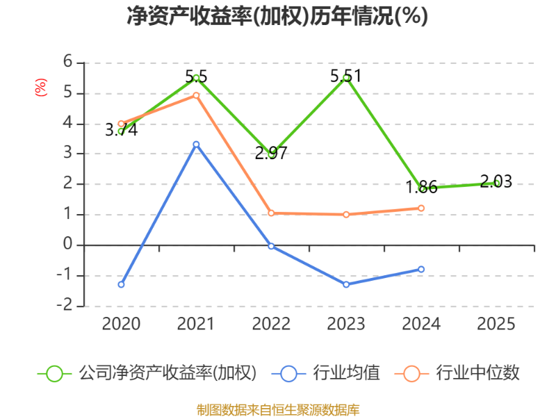 数据显示,2025年公司加权平均净资产收益率为2.03%,较上年同期上升0.17个百分点。公司2025年投入资本回报率为0.46%,较上年同期下降0.08个百分点。