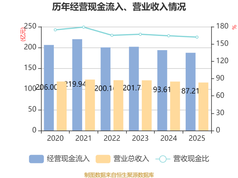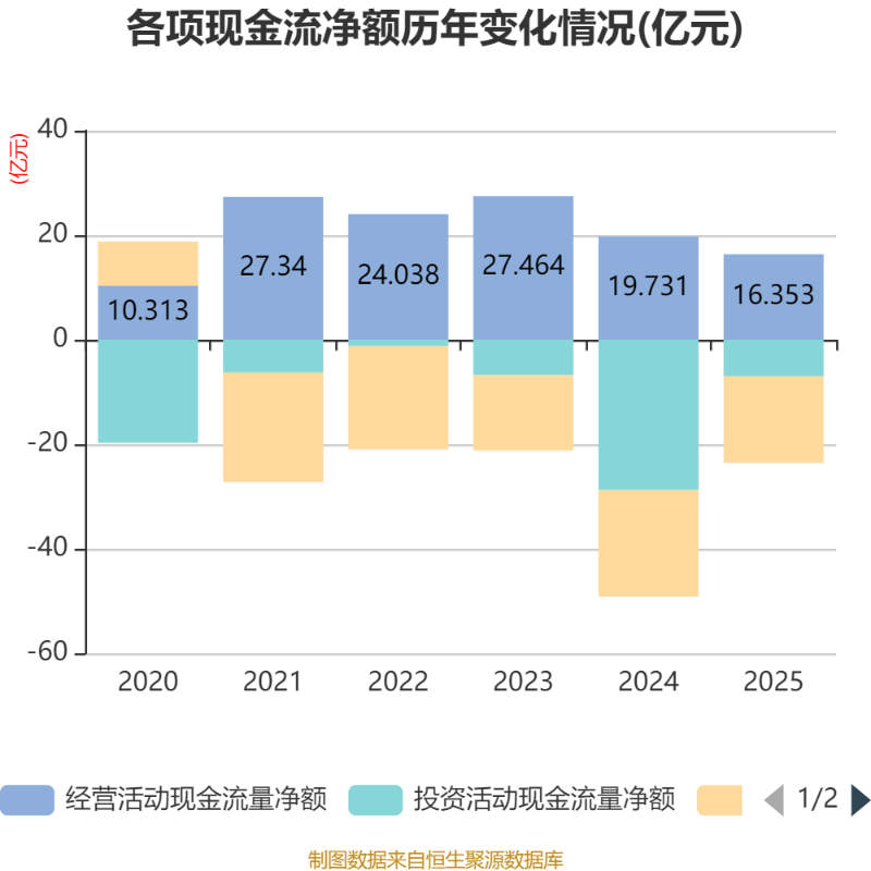 截至2025年,公司经营活动现金流净额为16.35亿元,同比下降17.12%;筹资活动现金流净额-16.58亿元,同比增加3.83亿元;投资活动现金流净额-6.98亿元,上年同期为-28.77亿元。