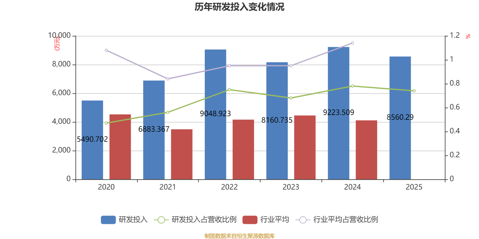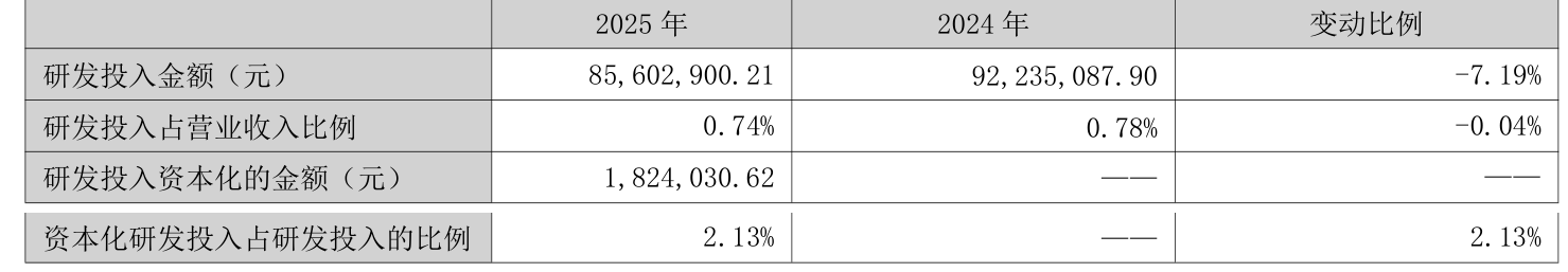2025年全年,公司研发投入金额为8560.29万元,同比下降7.19%;研发投入占营业收入比例为0.74%,相比上年同期下降0.04个百分点。此外,公司全年研发投入资本化率为2.13%。