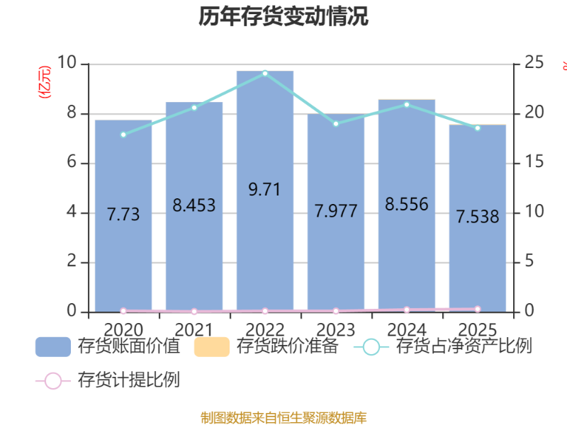 从存货变动来看,截至2025年末,公司存货账面价值为7.54亿元,占净资产的18.52%,较上年末减少1.02亿元。其中,存货跌价准备为200.02万元,计提比例为0.26%。