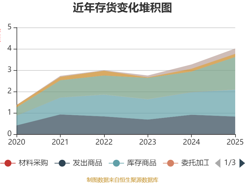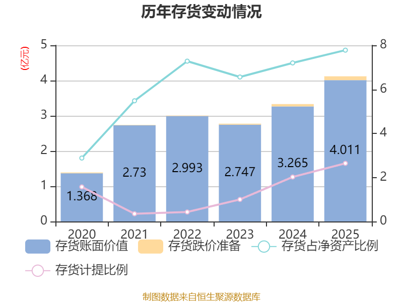 从存货变动来看,截至2025年末,公司存货账面价值为4.01亿元,占净资产的7.78%,较上年末增加7460.26万元。其中,存货跌价准备为1087.78万元,计提比例为2.64%。