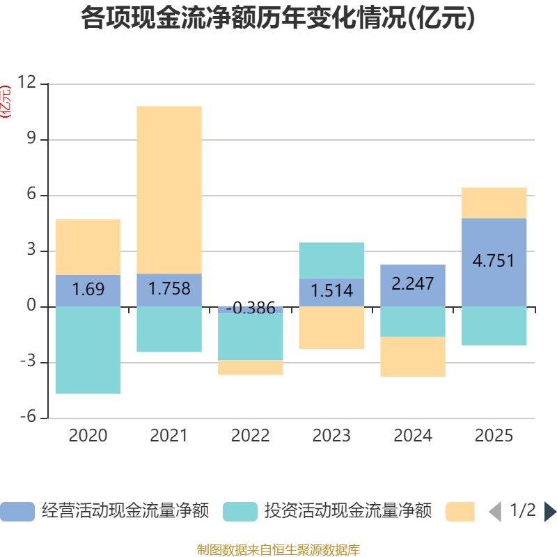 截至2025年,公司经营活动现金流净额为4.75亿元,同比增长111.4%;筹资活动现金流净额1.65亿元,同比增加3.79亿元;投资活动现金流净额-2.11亿元,上年同期为-1.64亿元。