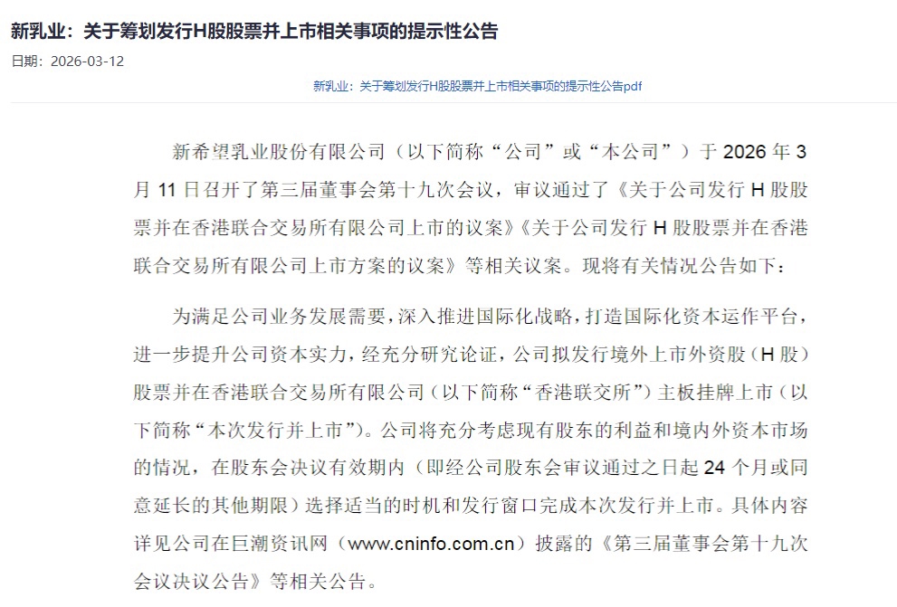 新乳业日前发布公告称,公司于3月11日召开了第三届董事会第十九次会议,审议通过了《关于公司发行H股股票并在香港联合交易所有限公司上市的议案》《关于公司发行H股股票并在香港联合交易所有限公司上市方案的议案》等相关议案。