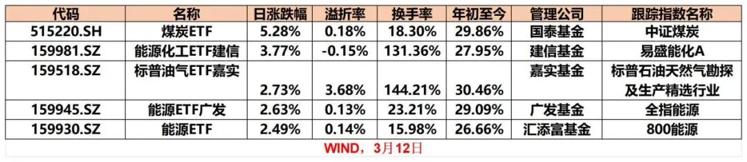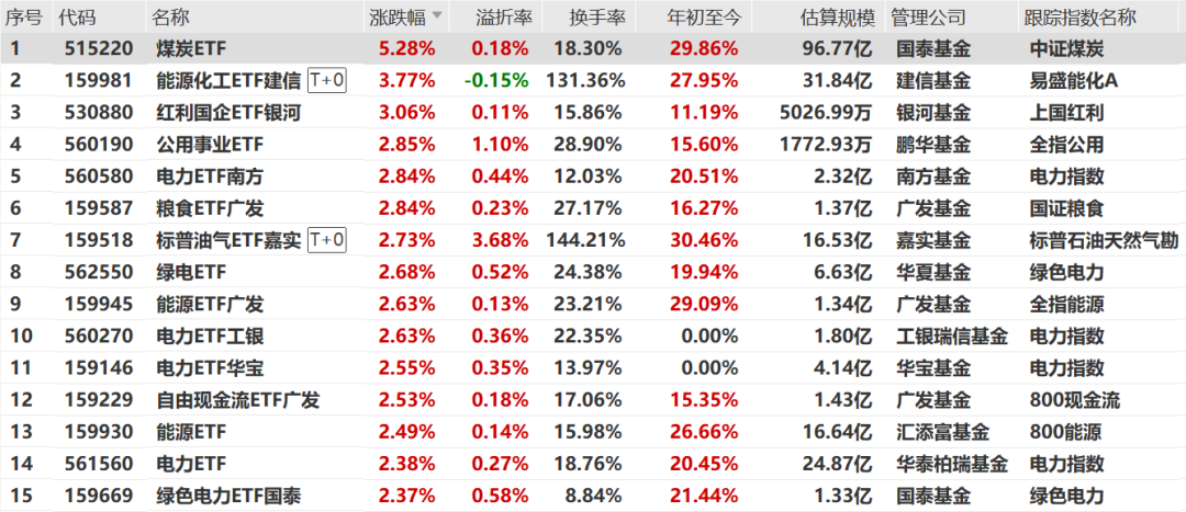 ETF方面,煤炭、能源化工及电力公用事业相关ETF逆市走强。