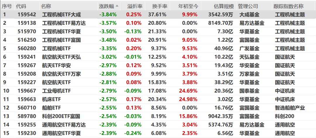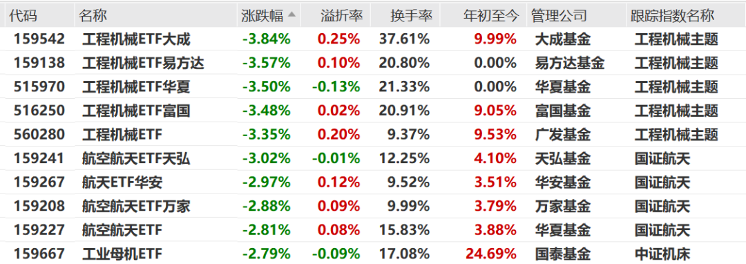 工程机械、航空航天相关ETF领跌。
