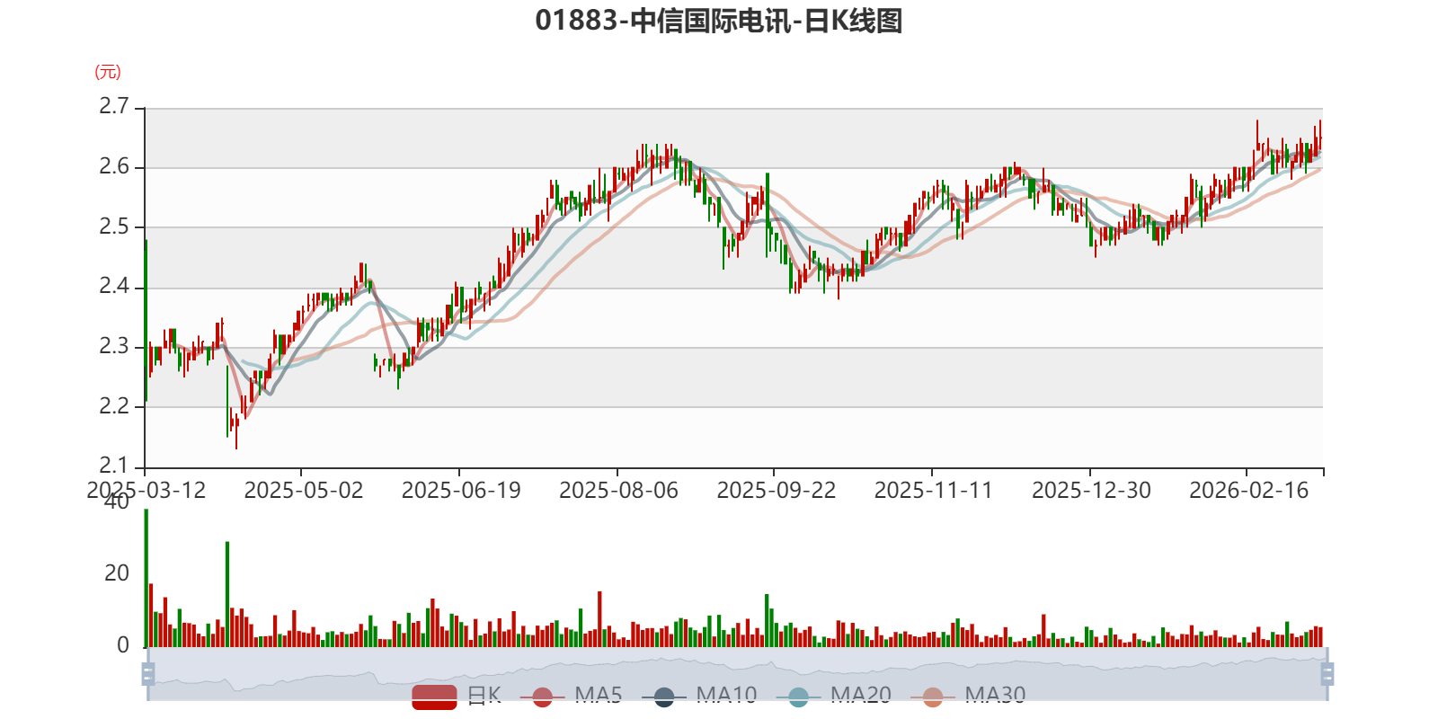 以3月12日收盘价计算,中信国际电讯目前市盈率(TTM)约10.66倍,市净率(TTM)约0.89倍,市销率(TTM)约1.03倍。
