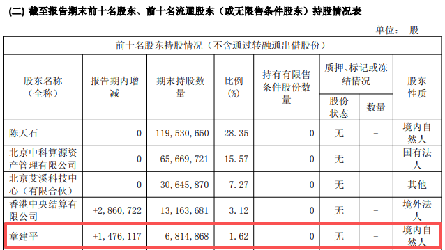 年报显示,与2025年三季报相比,寒武纪第五大股东章建平持仓增加40.84万股至681.49万股,占流通股比例的1.62%。按3月12日收盘价1099元/股计算,章建平持仓市值近75亿元。