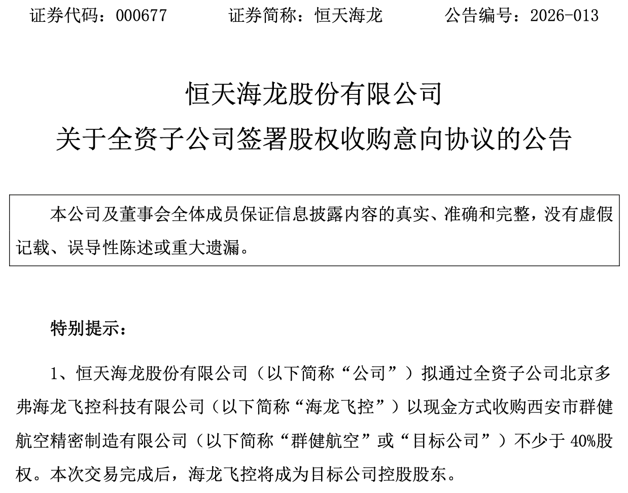 3月12日,恒天海龙(000677)公告,公司拟通过全资子公司北京多弗海龙飞控科技有限公司(简称“海龙飞控”)以现金方式收购西安市群健航空精密制造有限公司(简称“群健航空”或“目标公司”)不少于40%股权。