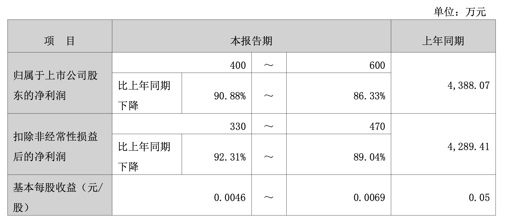 公司预计2025年归母净利润400万元至600万元,同比下降86.33%-90.88%;扣非净利润预计330万元-470万元,同比下降89.04%-92.31%。