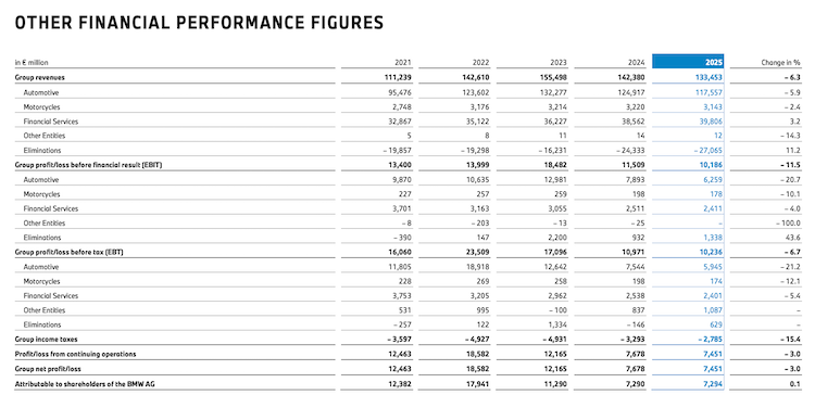3月12日,宝马集团发布2025年业绩报,全年营收为1334.53亿欧元,同比下降6.3%;税前利润(EBT)为102.36亿欧元,同比下降6.7%;净利润74.51亿欧元,同比下降3.0%。
