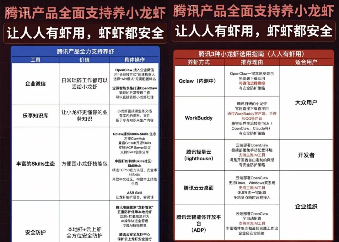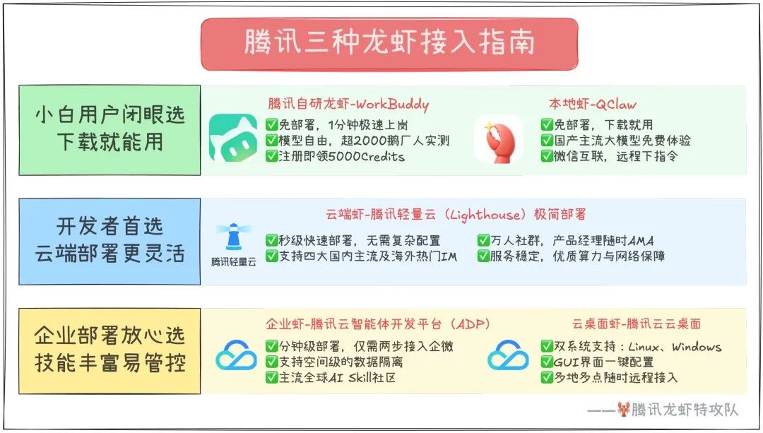 腾讯轻量云Lighthouse,一个QQ号能养5只小龙虾;云ADP,几分钟部署,能隔离敏感数据;腾讯云桌面,直接云端Windows环境里配置龙虾和使用。