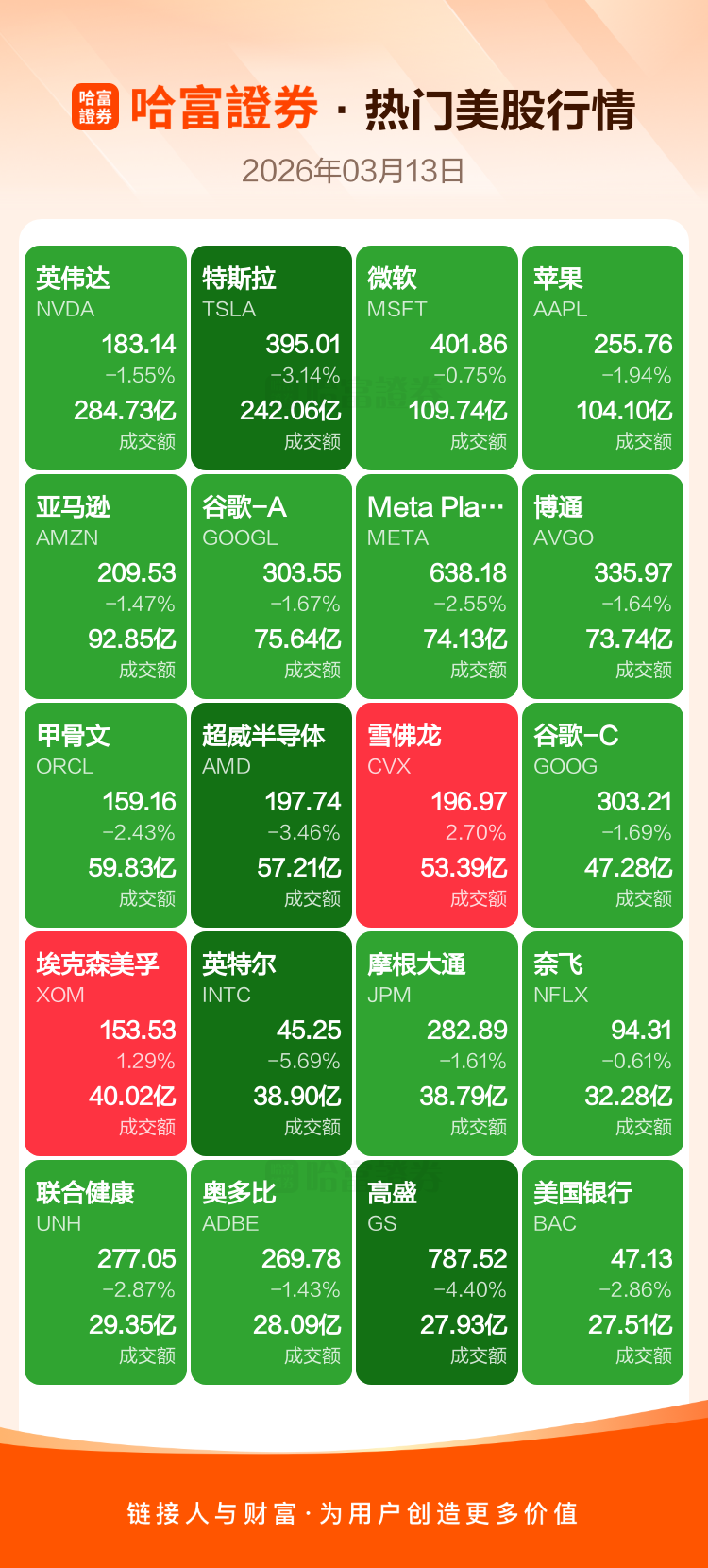 英伟达跌1.55%,特斯拉跌3.14%,微软跌0.75%,苹果跌1.94%,亚马逊跌1.47%,谷歌-A跌1.67%,Meta Platforms Inc-A跌2.55%,博通跌1.64%,甲骨文跌2.43%,超威半导体跌3.46%。