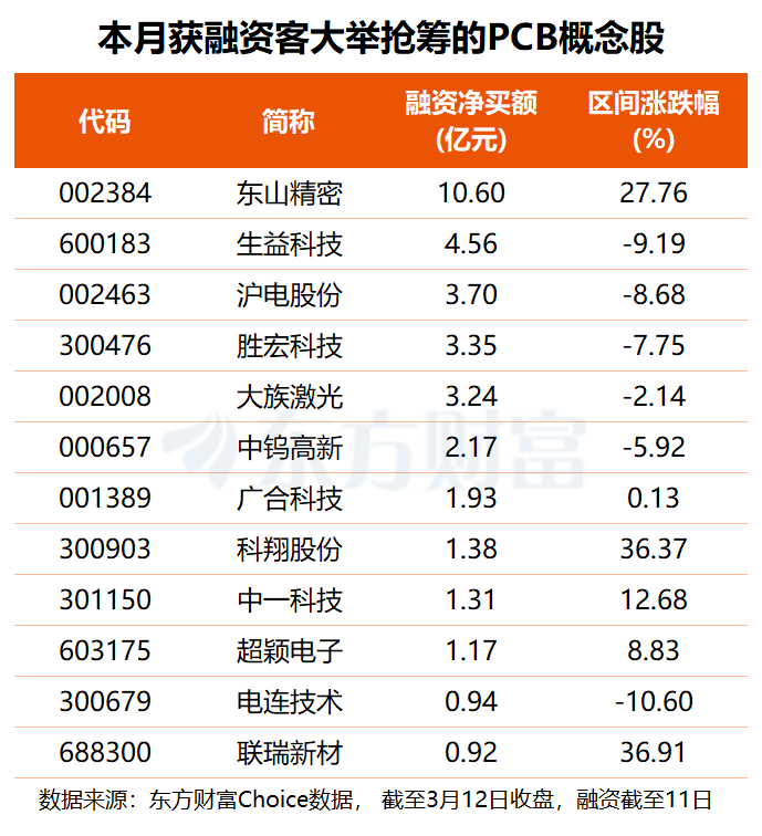 从资金角度看,东方财富Choice数据显示,3月以来,共有10只PCB概念股获得超亿元融资净买入,东山精密获杠杆资金大幅加仓10.60亿元,生益科技融资净买额达4.56亿元,沪电股份、胜宏科技、大族激光均获融资客抢筹超3亿元。