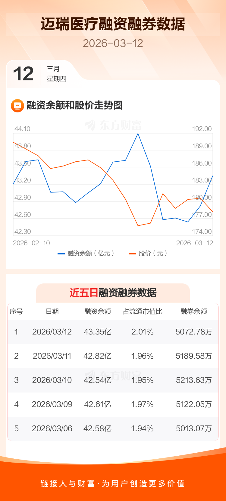 交易所最新数据显示,迈瑞医疗于2026年3月12日获融资买入1.25亿元,融资偿还7152.69万元,当日融资净买入5370.35万元。目前,该股融资余额43.35亿,占流通市值比例为2.01%。