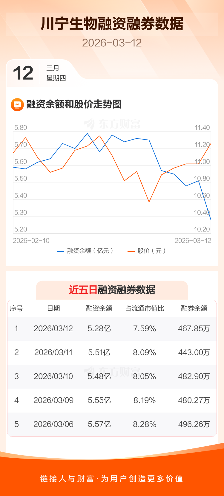 交易所最新数据显示,川宁生物于2026年3月12日获融资买入3590.63万元,融资偿还5877.80万元,当日融资净偿还2287.17万元。目前,该股融资余额5.28亿,占流通市值比例为7.59%。
