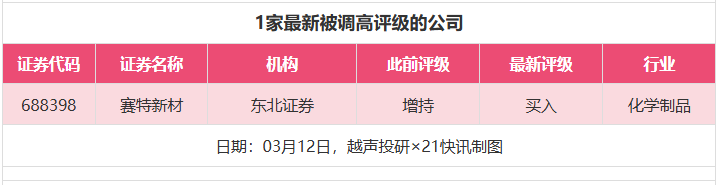 评级调高方面,3月12日,券商调高上市公司评级达到1家次,东北证券对赛特新材的评级从“增持”调高至“买入”。