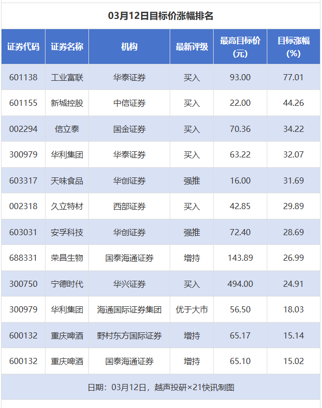 越声投研数据显示,3月12日,券商给予上市公司目标价共12次,按最新收盘价计算,目标价涨幅排名居前的公司有工业富联、新城控股、信立泰,目标价涨幅分别为77.01%、44.26%、34.22%,分别属于消费电子、房地产开发、化学制药行业。