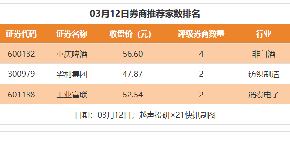 从券商推荐家数来看,3月12日有28家上市公司得到券商推荐,其中重庆啤酒获得4家推荐,华利集团、工业富联均获得2家推荐。