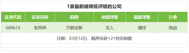评级调低方面,3月12日,券商调低上市公司评级达到1家次,万联证券对老凤祥的评级从“买入”调低至“增持”。