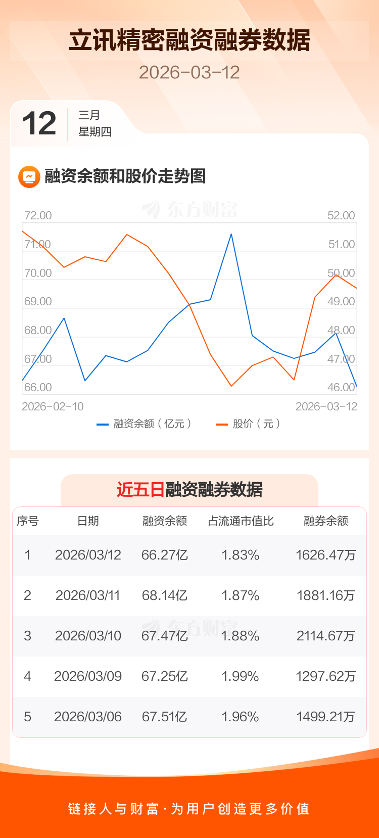 交易所最新数据显示,立讯精密于2026年3月12日获融资买入2.37亿元,融资偿还4.23亿元,当日融资净偿还1.87亿元。目前,该股融资余额66.27亿,占流通市值比例为1.83%。